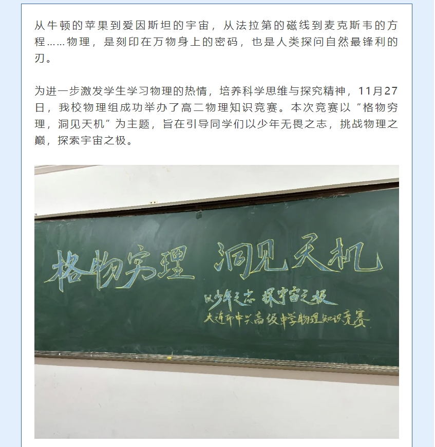 格物穷理,洞见天机、以少年之志,探宇宙之极--大连市中兴高级中学物理组成功举办高二物理知识竞赛